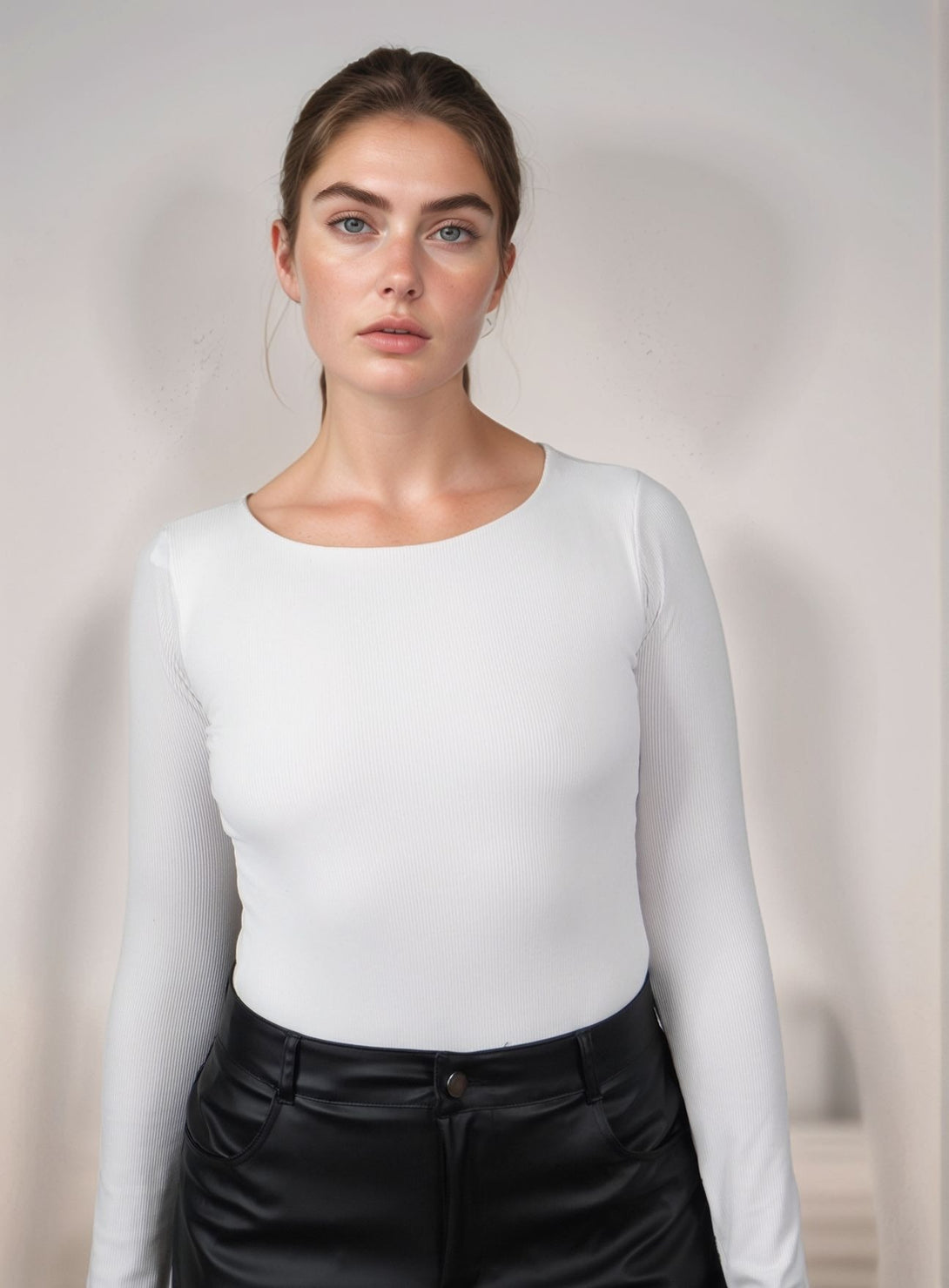 Este body de tela rib con escote en la espalda es ideal para combinar con pantalones casuales o formales. Su diseño de espalda abierta añade un toque coqueto y único a cualquier conjunto. Composición: 95% poliéster, 5% spandex.