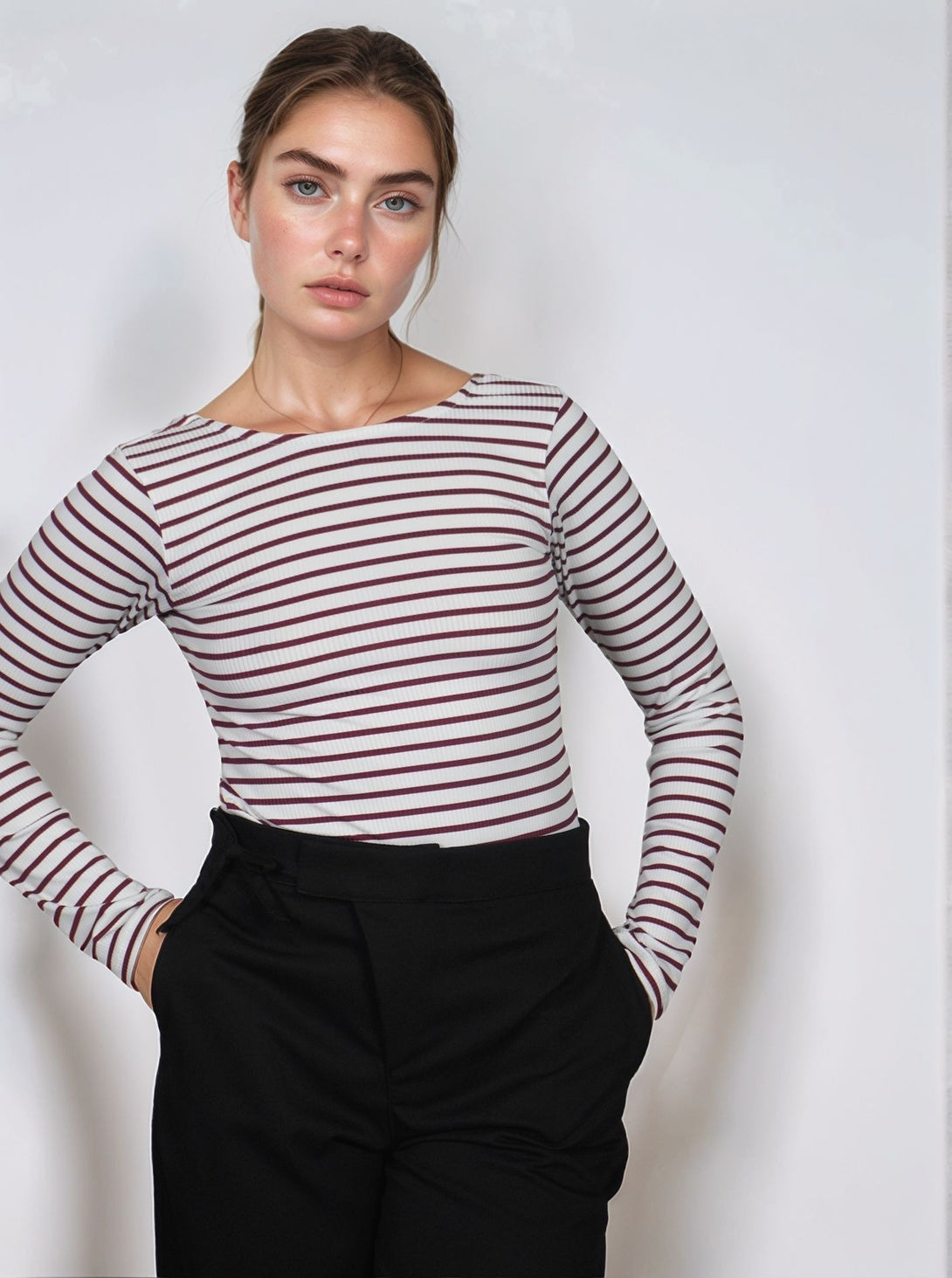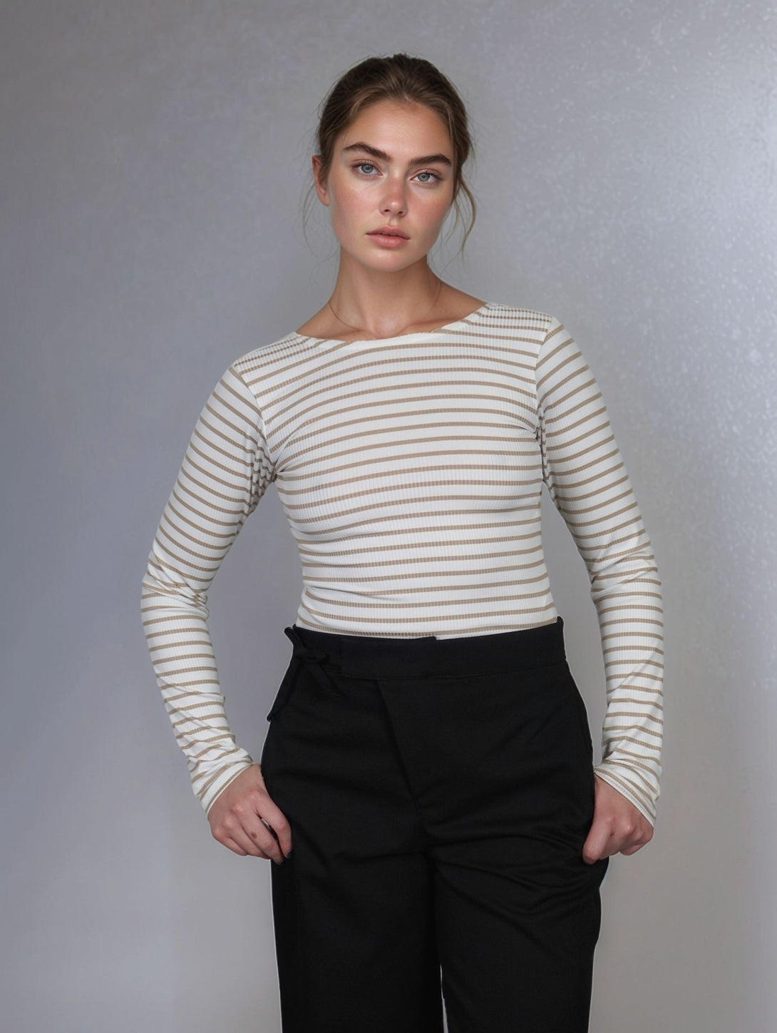 Este body con espalda descubierta es ideal para añadir un toque de sensualidad sutil 😘, ajustándose perfectamente al cuerpo para estilizar tu figura ✨. Está fabricado en tela rib con un elegante estampado de rayas horizontales .