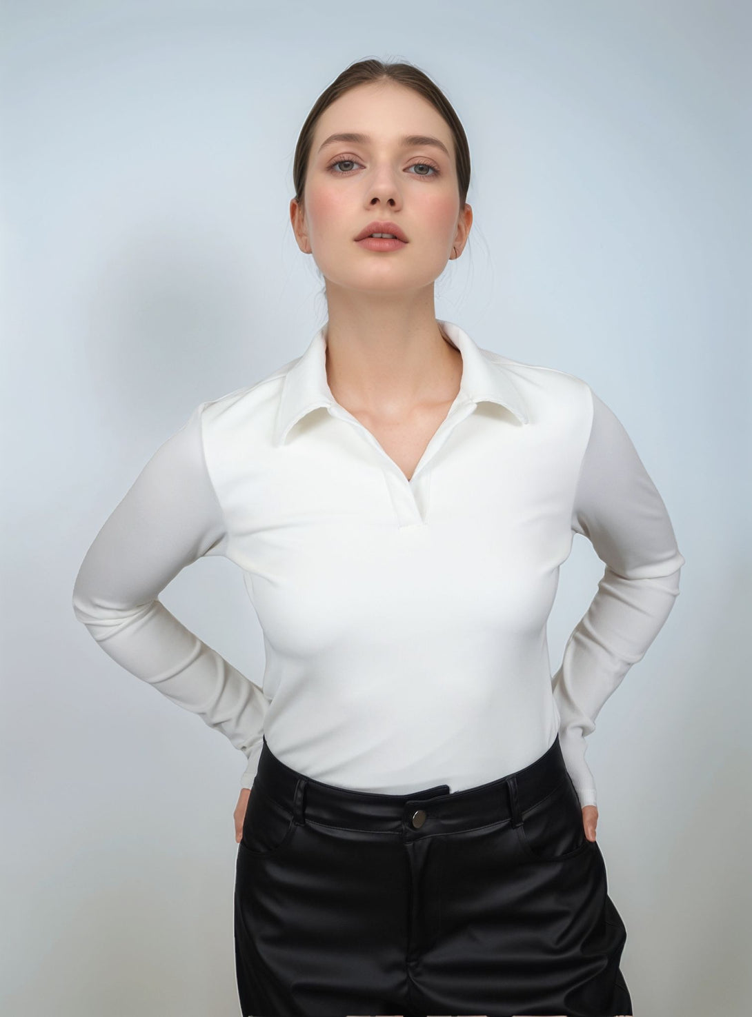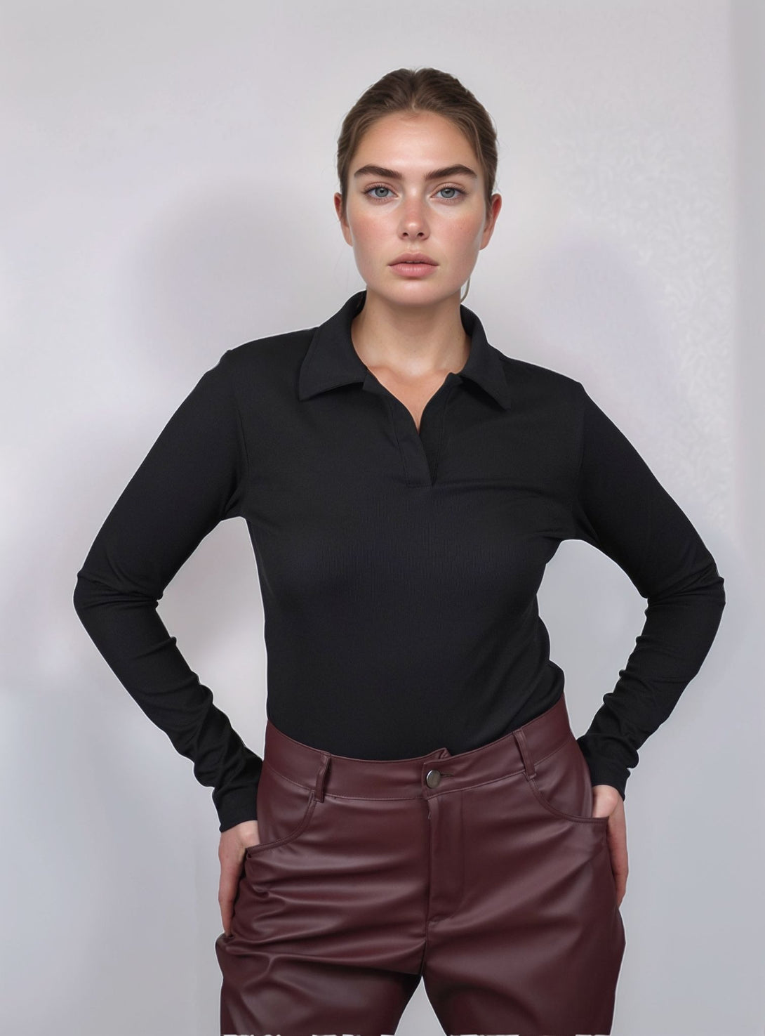 - Este body con cuello tipo polo y mangas largas está hecho en lycra de canal delgado, con un práctico broche de botón para que te lo pongas sin complicaciones. La tela rib, con 96% poliéster y 4% elastano, te ofrece un ajuste cómodo que realza tu figura con estilo y diversión.