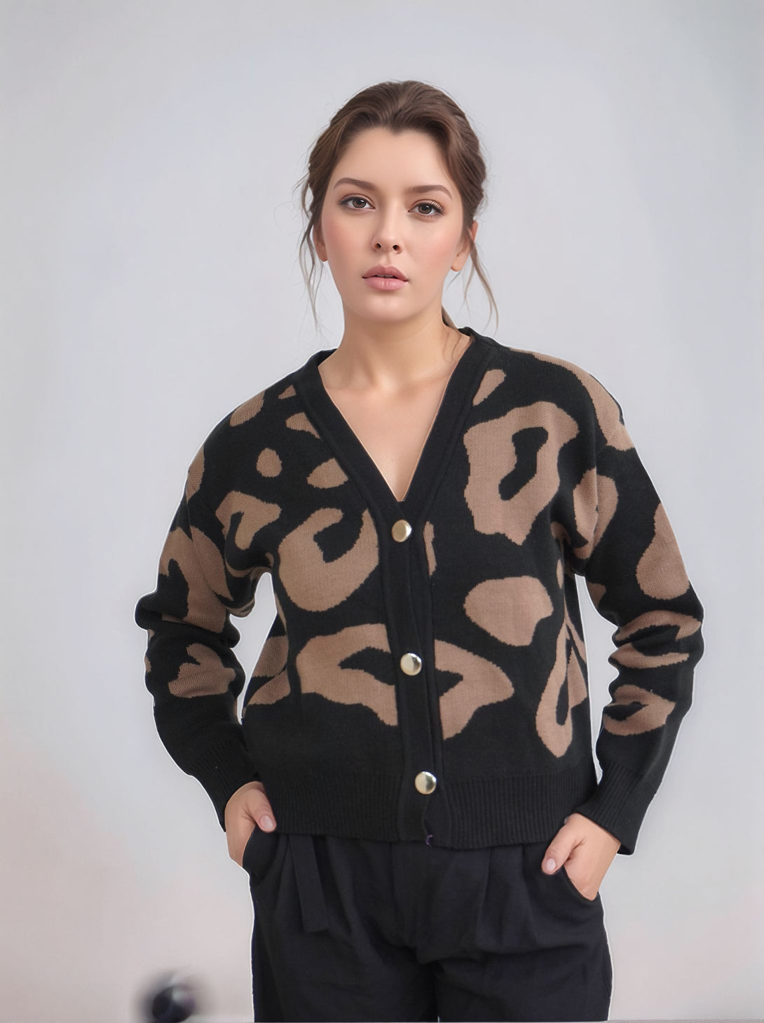 Suéter abierto de acrílico con diseño de animal print y botones frontales.