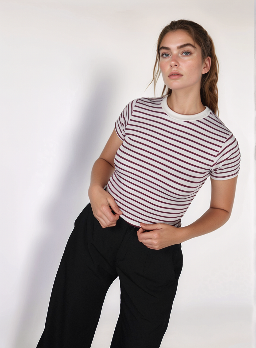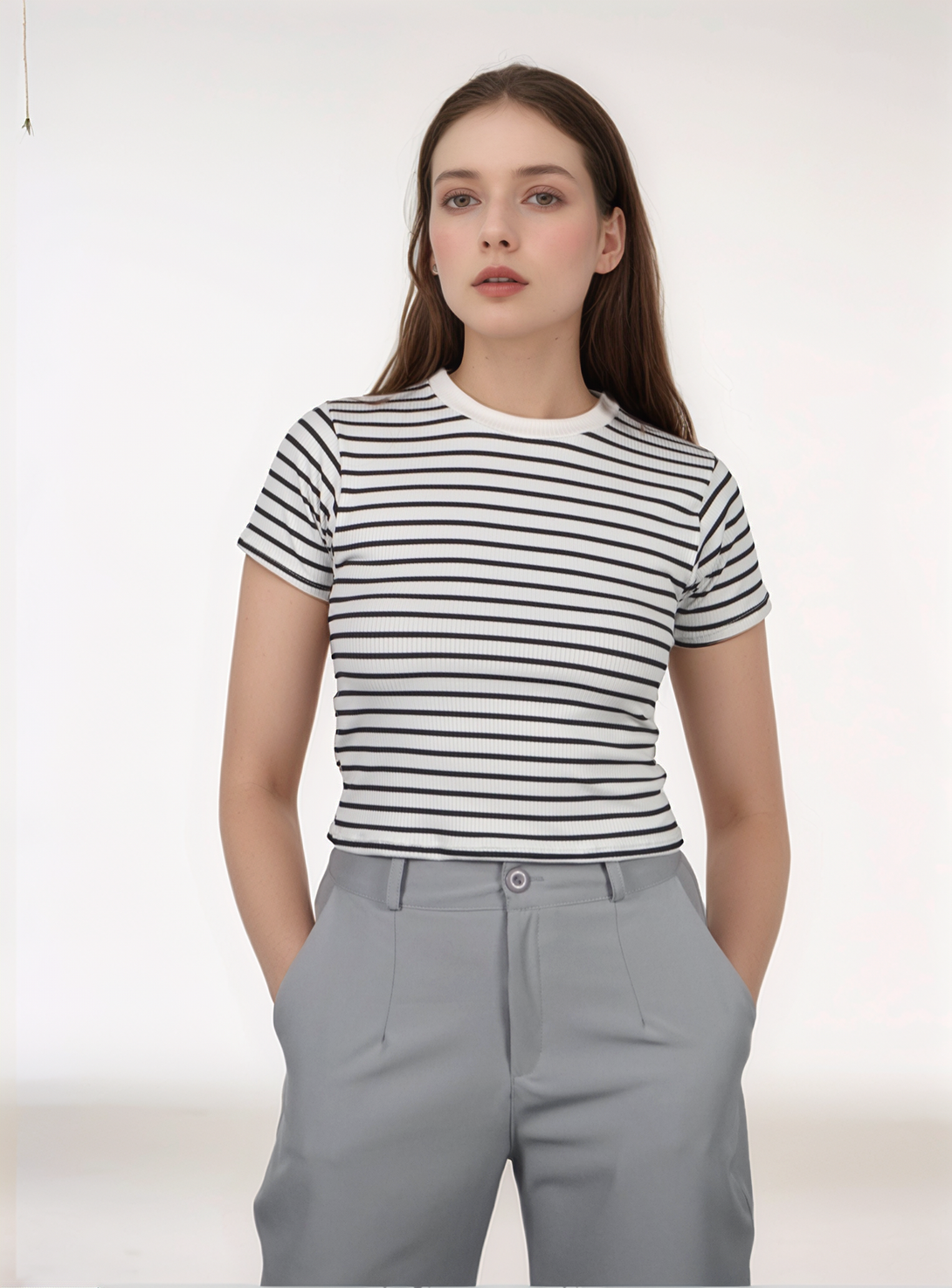Camiseta crop en rib que se adapta al cuerpo, confeccionada con tela lycrada para mayor comodidad y elasticidad.