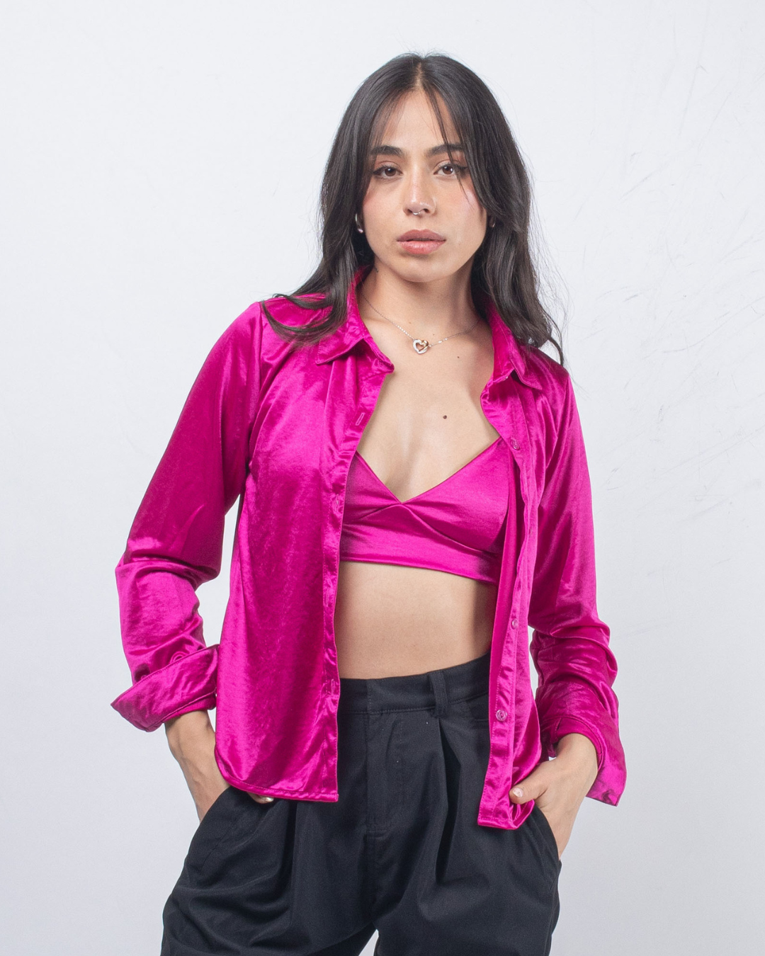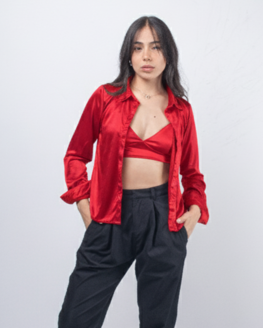 CONJUNTO EN SATIN COMPUESTO DE UN TOP Y UNA CAMISA EN SATÍN