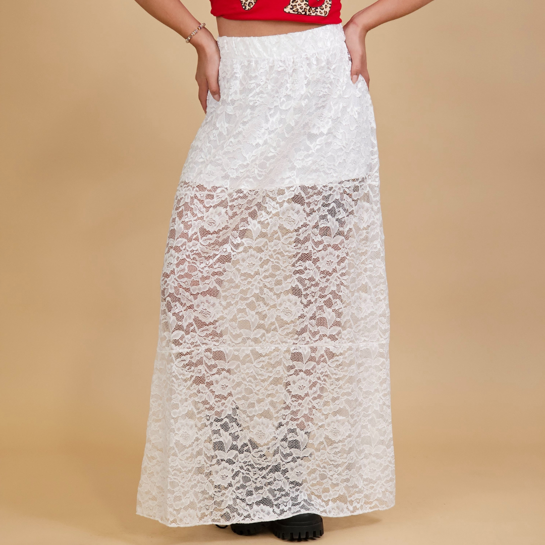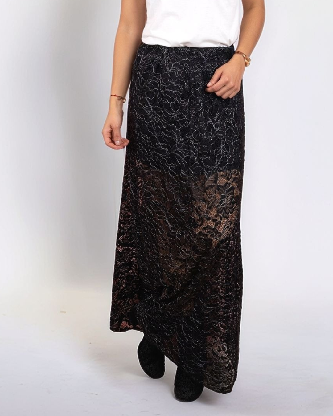 FALDA EN BLONDA CON FLORES BORDE METALIZADO EN EL COLOR NEGRO.