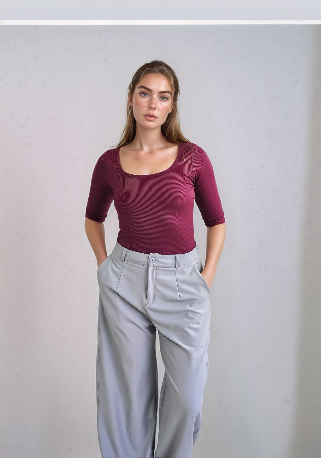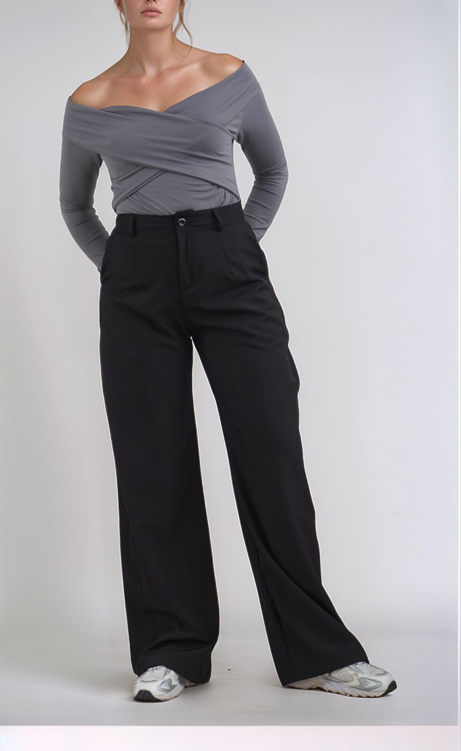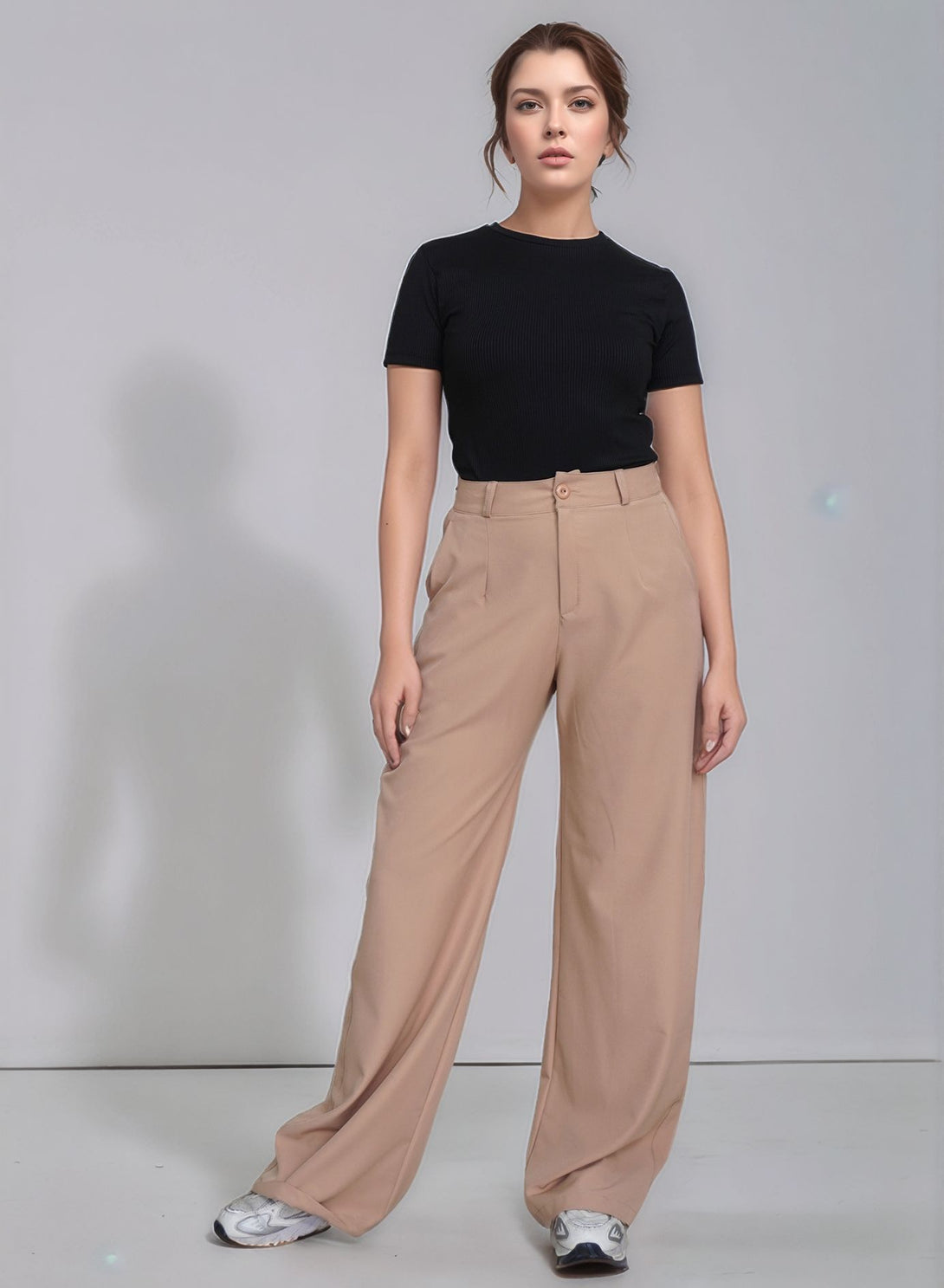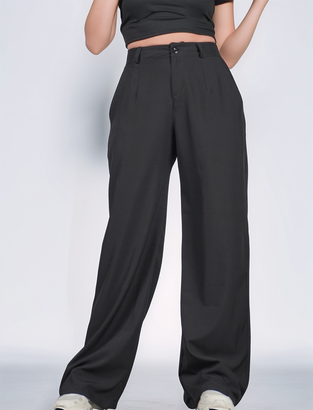 Este pantalón wideleg básico cuenta con pliegues en la parte frontal y prácticos bolsillos, ofreciendo comodidad y estilo para el uso diario.
