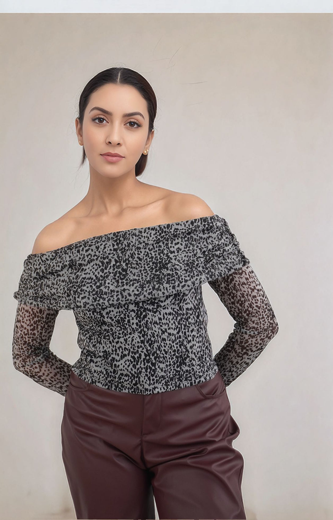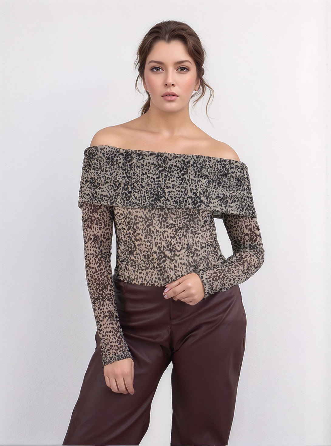 Top bandeja confeccionado en mallatex con un estampado de animal print, que incluye forro en la parte frontal para mayor comodidad y acabado.