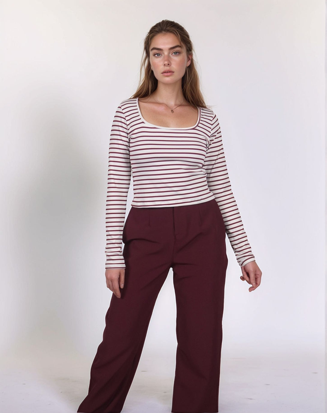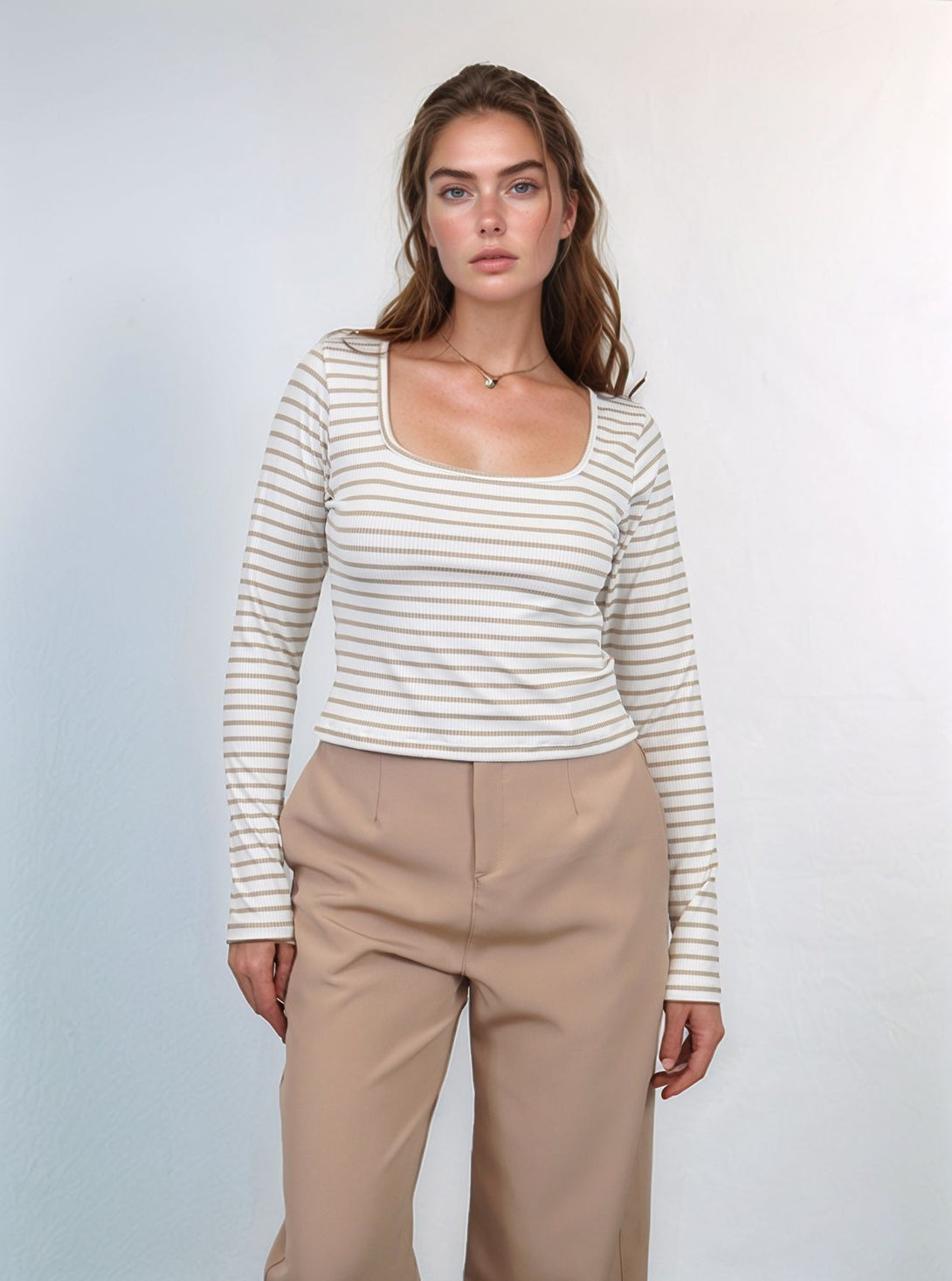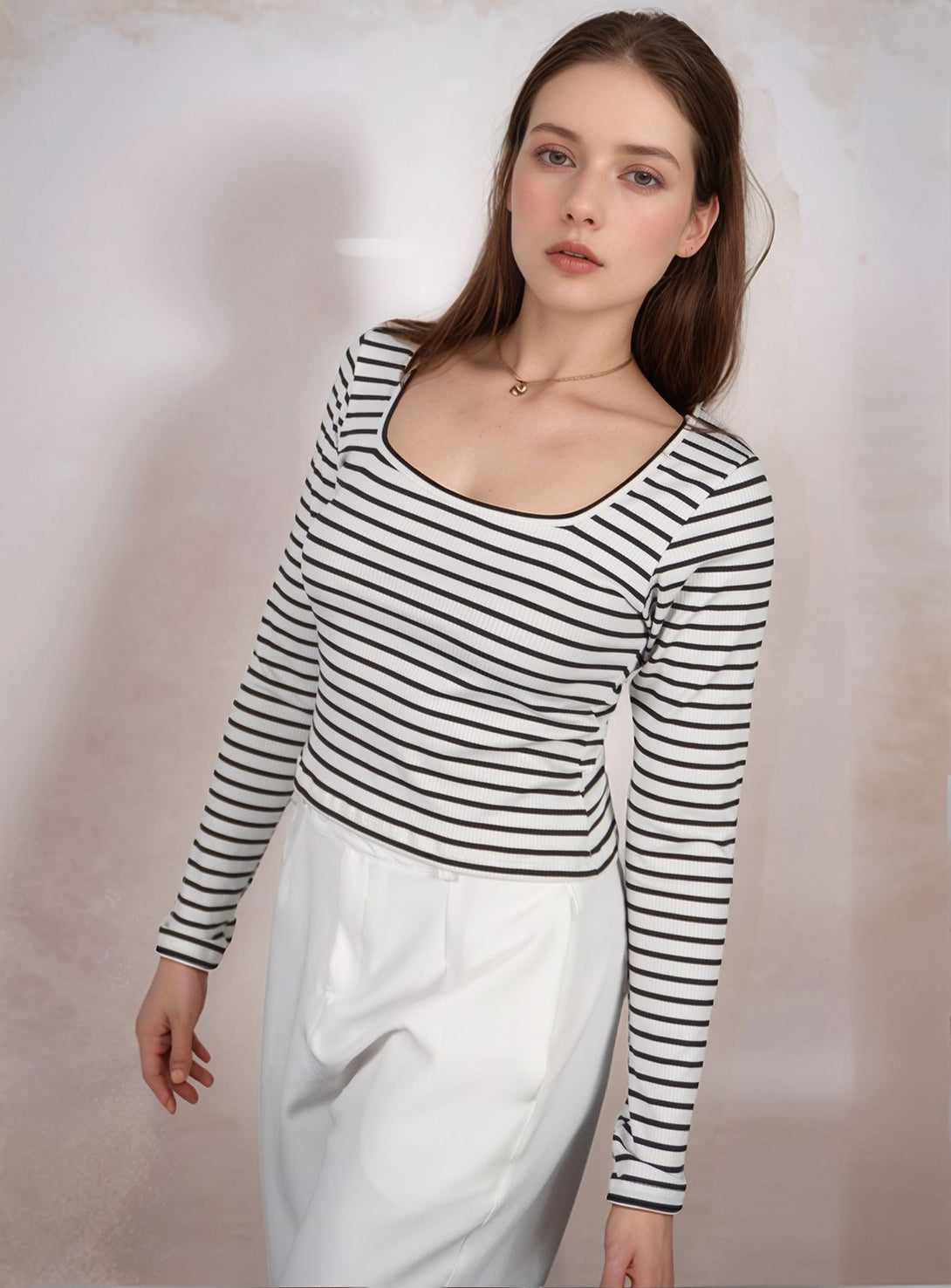 Top estilo bandeja confeccionado en tejido lycra con un diseño de finas rayas estampadas.
