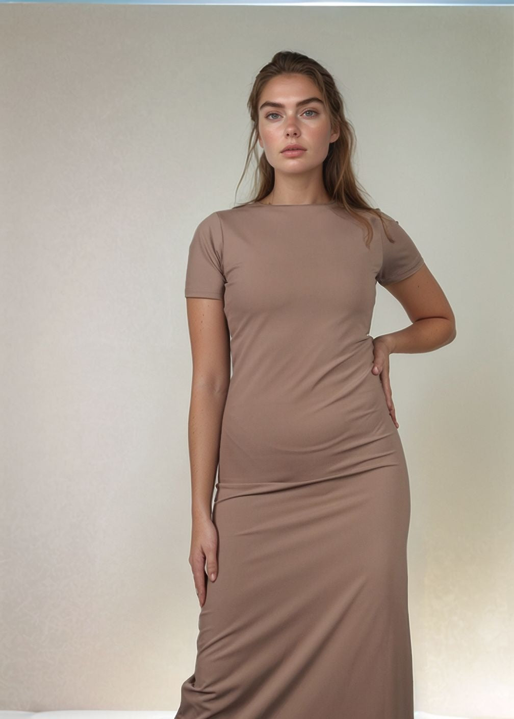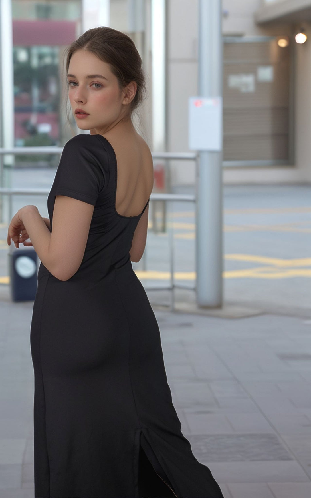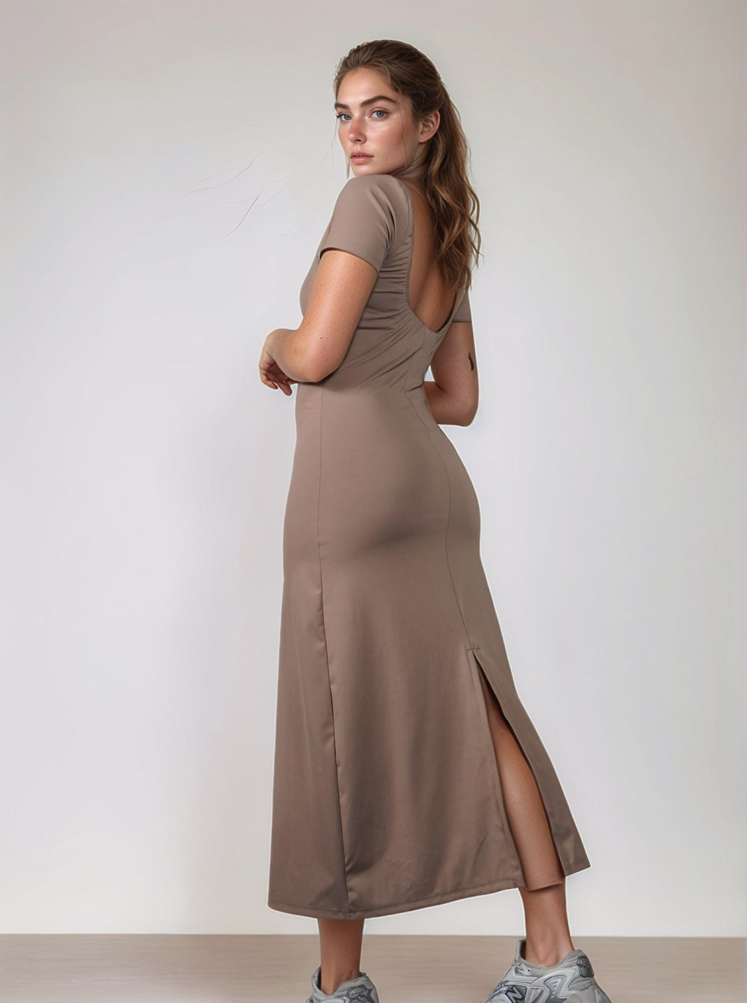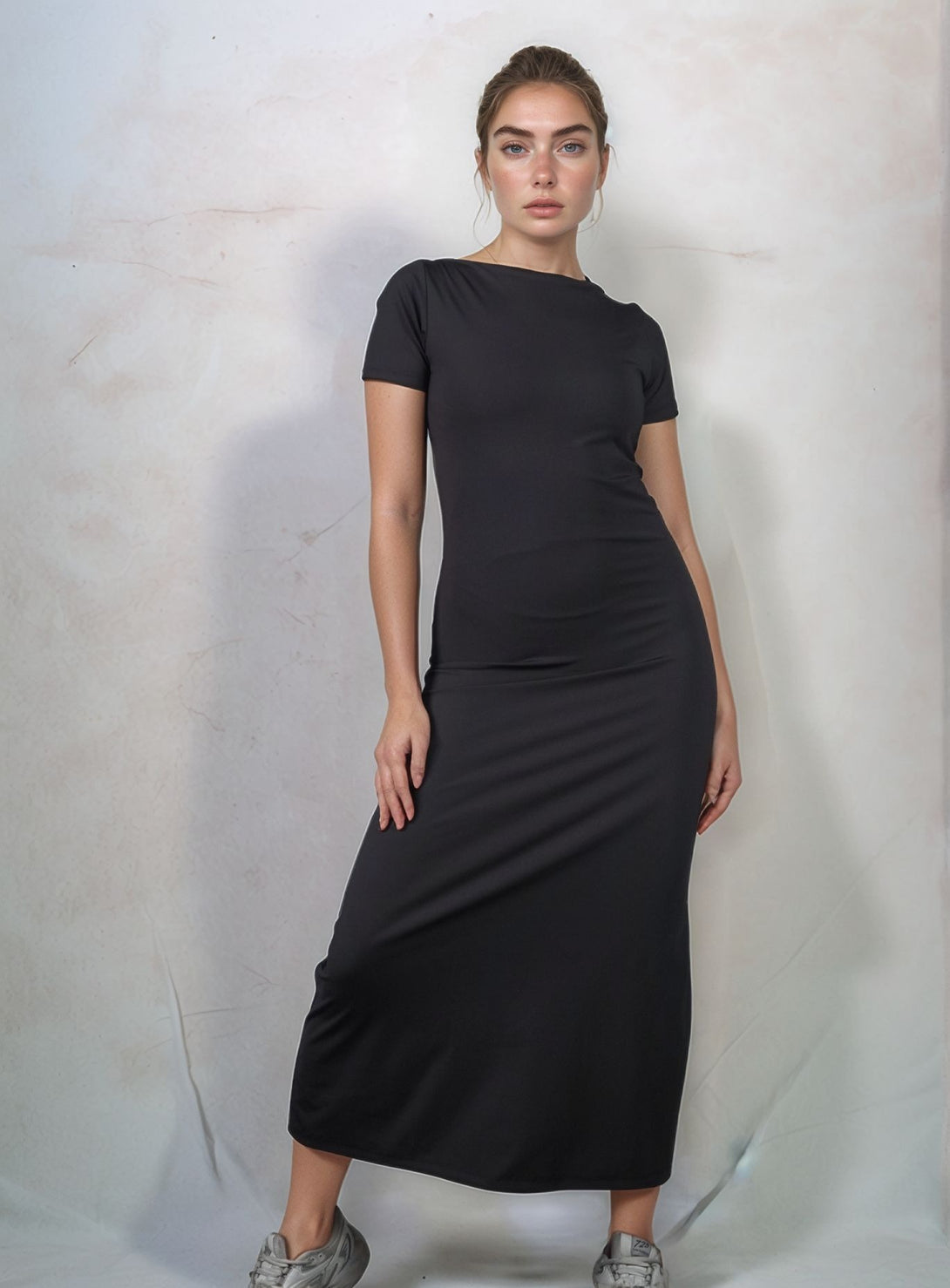 MAXI VESTIDO MANGA CORTA CON ESCOTE CUADRADO OEN LA ESPALDA, SE AJUSTA PERFECTO AL CUERPO